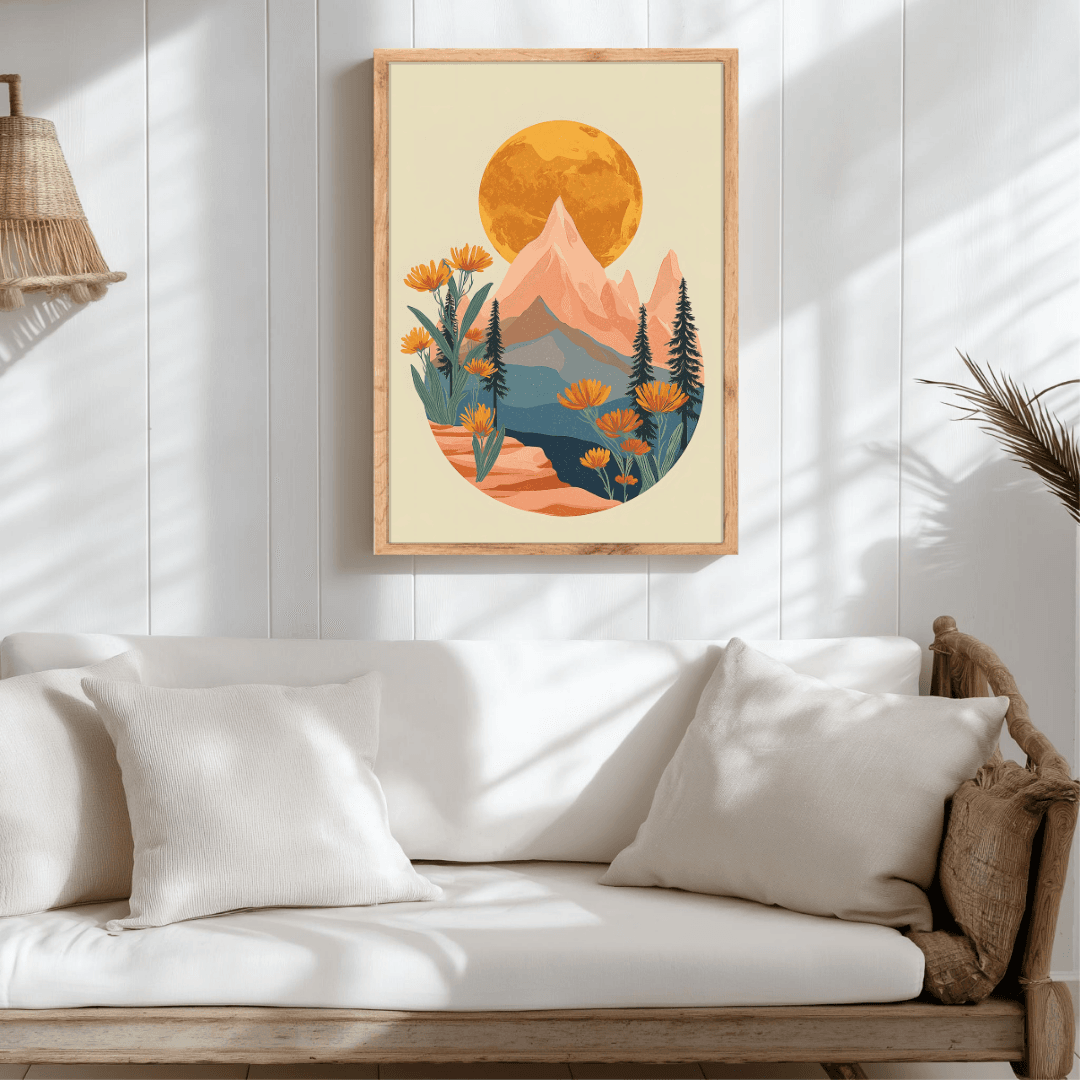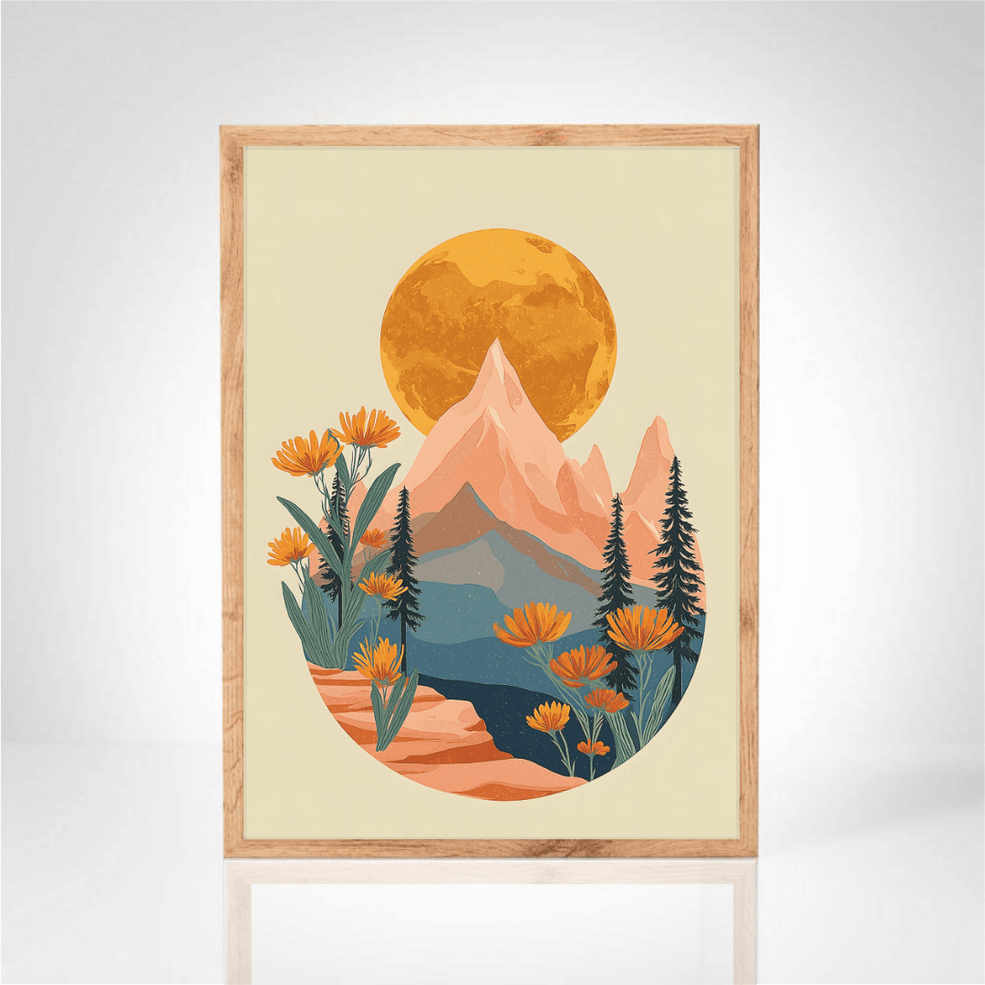 Ajoutez une touche unique à votre intérieur avec cette affiche artistique représentant un paysage stylisé : un grand soleil orangé se levant derrière des montagnes rosées, entouré de pins sombres et de fleurs éclatantes au premier plan. Cette illustration évoque la nature, la sérénité et la chaleur grâce à ses formes épurées et ses couleurs vibrantes.